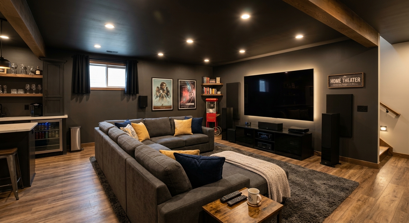 Aménagement de bar humide, salle de jeux ou cinéma maison au sous-sol.