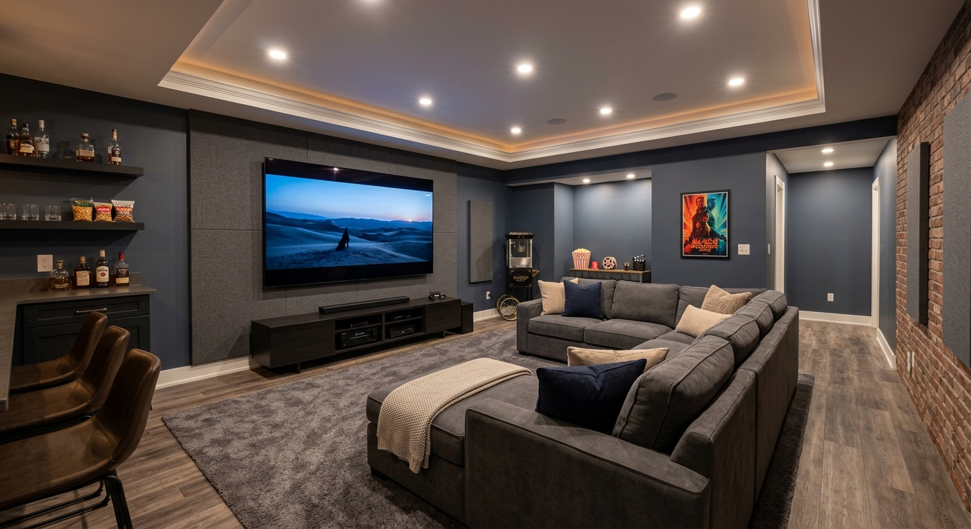 Aménagement de bar humide, salle de jeux ou cinéma maison au sous-sol.