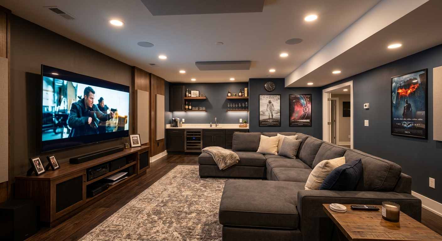 Aménagement de bar humide, salle de jeux ou cinéma maison au sous-sol.